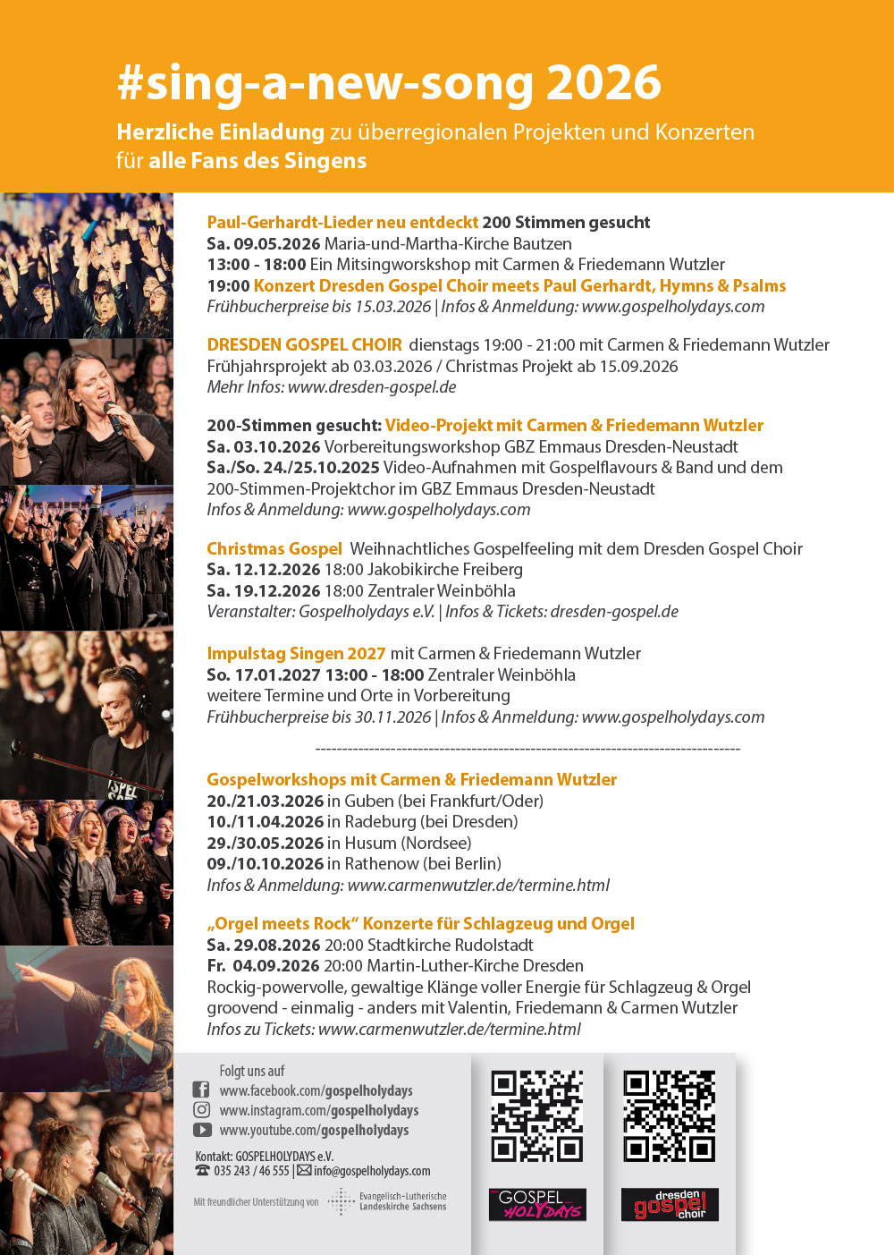 Paul-Gerhardt-Lieder neu entdeckt 200 Stimmen gesucht Sa. 09.05.2026 Maria-und-Martha-Kirche Bautzen 13:00 - 18:00 Ein Mitsingworskshop mit Carmen & Friedemann Wutzler 19:00 Konzert Dresden Gospel Choir meets Paul Gerhardt, Hymns & Psalms Frühbucherpreise bis 05.04.2026 | Mehr Infos & Anmeldung